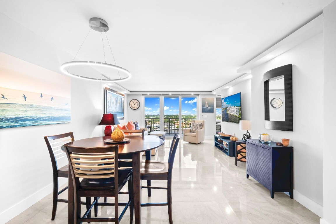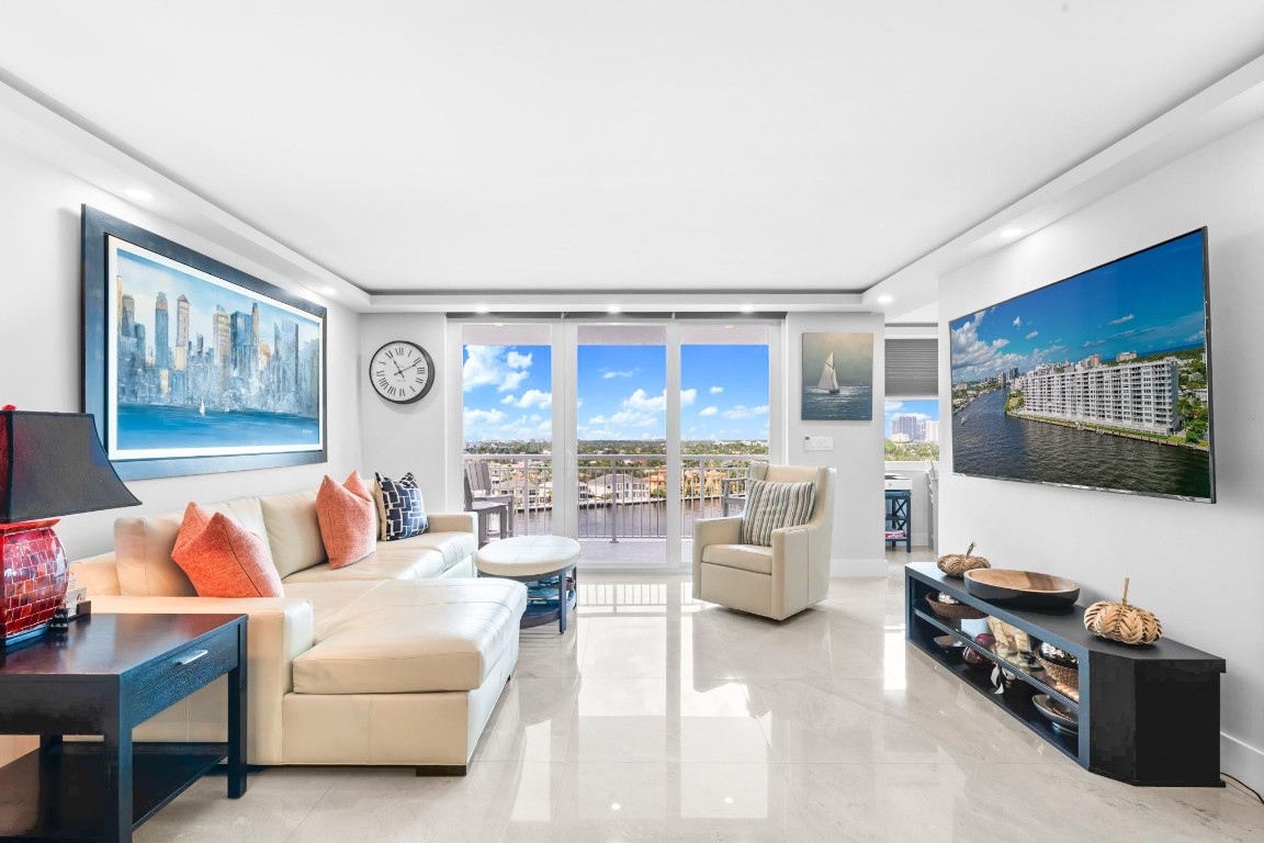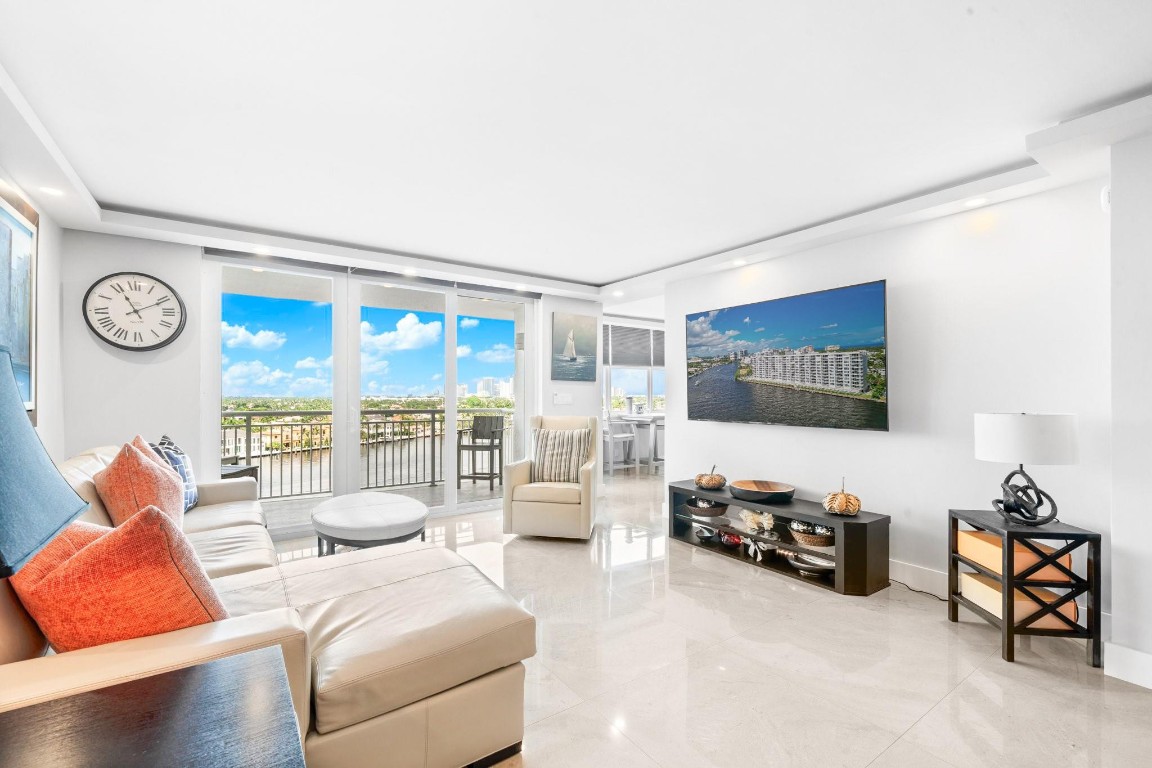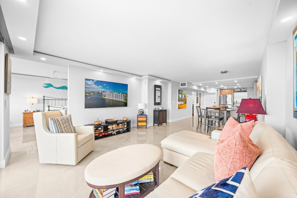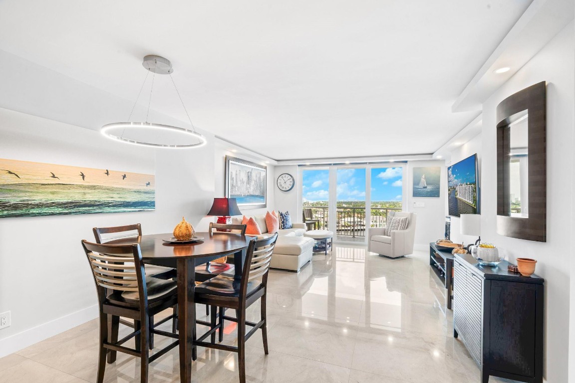 Pristine Penthouse overlooking the wide waters of the Intracoastal. Remodeled with porcelain tile floors throughout, modern kitchen with custom cabinetry, island, quartz countertops & LED lighting. Open concept living provides a spacious living/dining area leading out to the private covered terrace with remarkable views. The primary suite features an upgraded bath with glass enclosed walk-in shower, illuminated mirror, and floating vanity. Washer and dryer in the unit. Garage parking and storage included. Great beach location building amenities include Lobby entry, spacious clubroom with full kitchen, billiard room, fitness center, library, saunas, BBQ grills and rooftop sundeck. Sunny heated saline pool on the Intracoastal Waterway