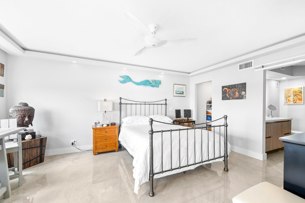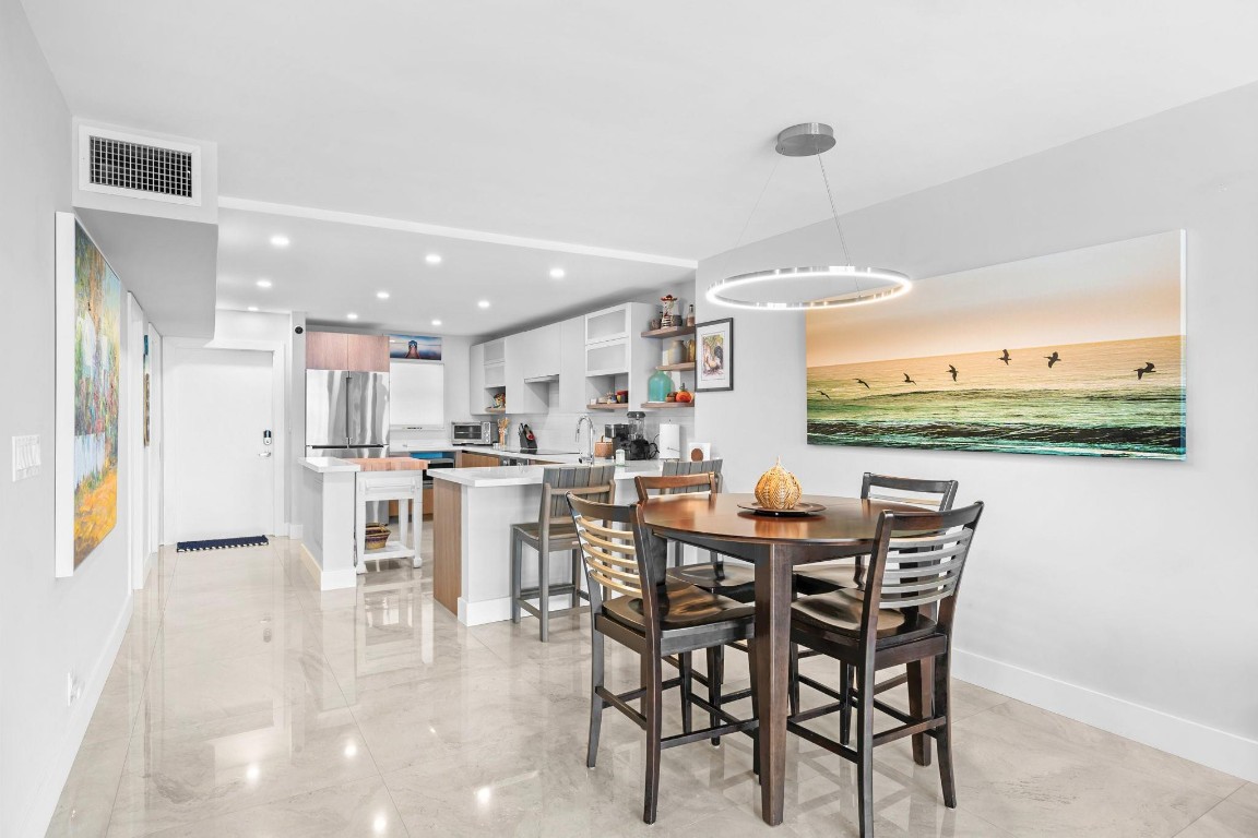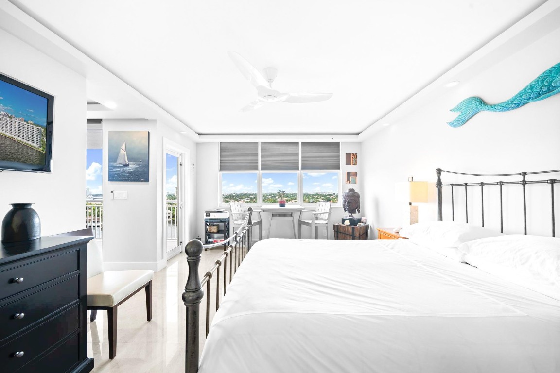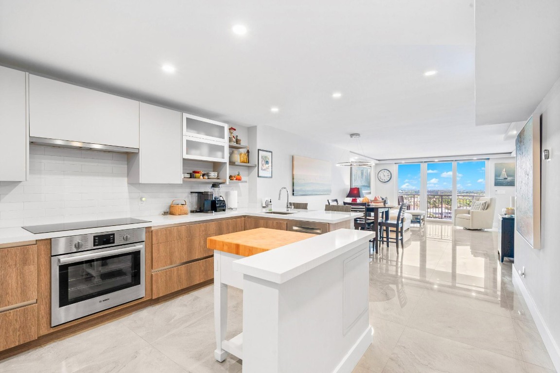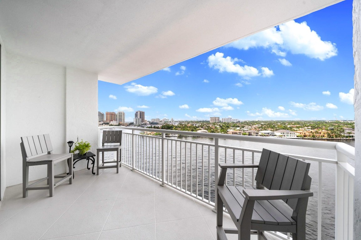 Pristine Penthouse overlooking the wide waters of the Intracoastal. Remodeled with porcelain tile floors throughout, modern kitchen with custom cabinetry, island, quartz countertops & LED lighting. Open concept living provides a spacious living/dining area leading out to the private covered terrace with remarkable views. The primary suite features an upgraded bath with glass enclosed walk-in shower, illuminated mirror, and floating vanity. Washer and dryer in the unit. Garage parking and storage included. Great beach location building amenities include Lobby entry, spacious clubroom with full kitchen, billiard room, fitness center, library, saunas, BBQ grills and rooftop sundeck. Sunny heated saline pool on the Intracoastal Waterway