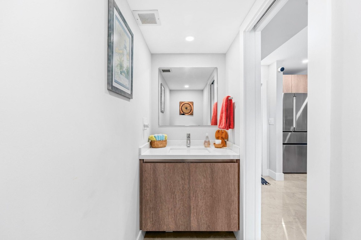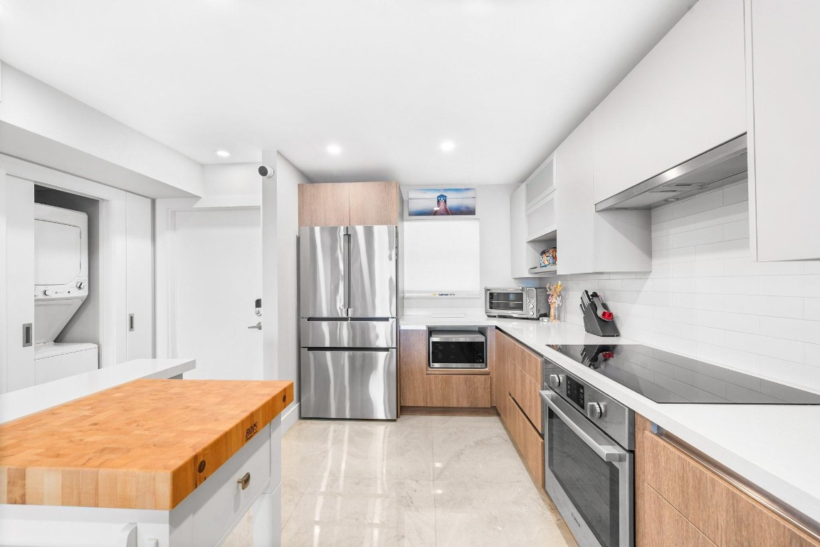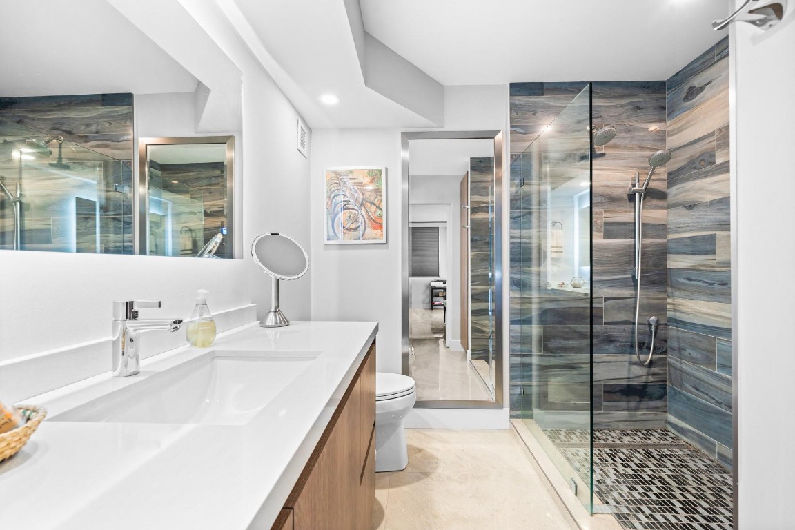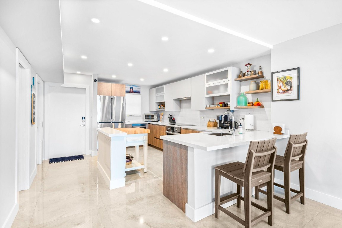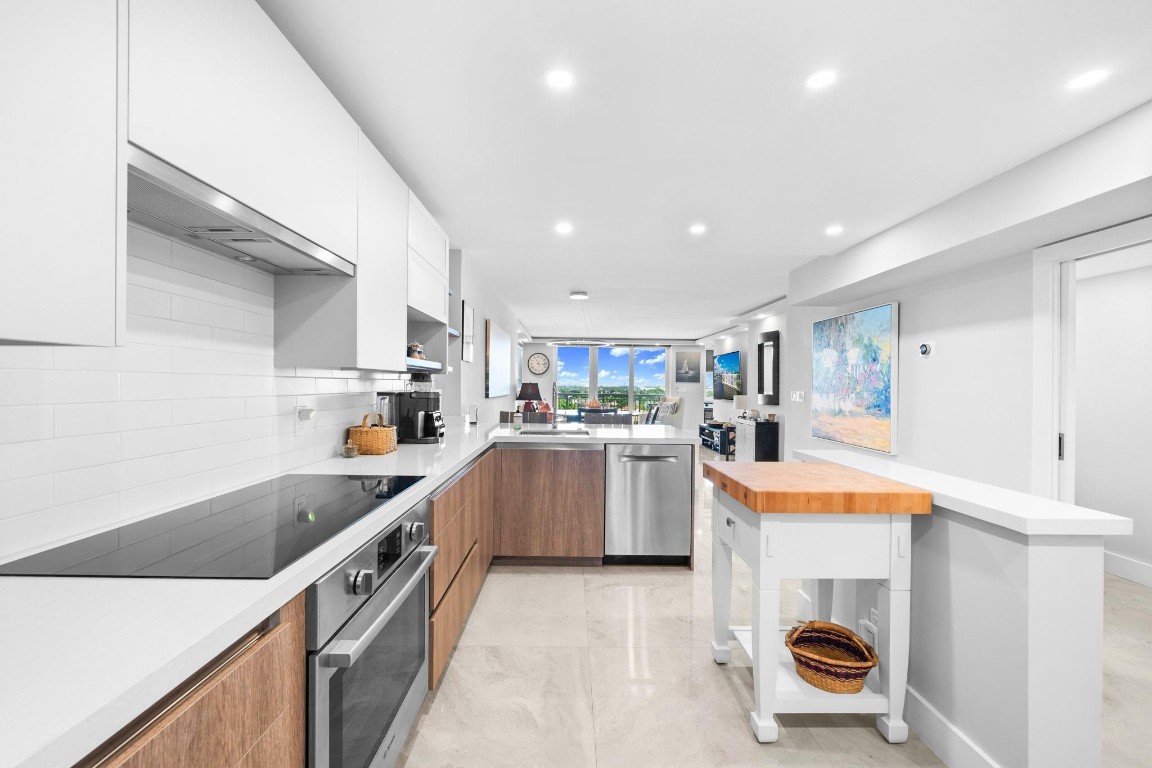 Pristine Penthouse overlooking the wide waters of the Intracoastal. Remodeled with porcelain tile floors throughout, modern kitchen with custom cabinetry, island, quartz countertops & LED lighting. Open concept living provides a spacious living/dining area leading out to the private covered terrace with remarkable views. The primary suite features an upgraded bath with glass enclosed walk-in shower, illuminated mirror, and floating vanity. Washer and dryer in the unit. Garage parking and storage included. Great beach location building amenities include Lobby entry, spacious clubroom with full kitchen, billiard room, fitness center, library, saunas, BBQ grills and rooftop sundeck. Sunny heated saline pool on the Intracoastal Waterway
